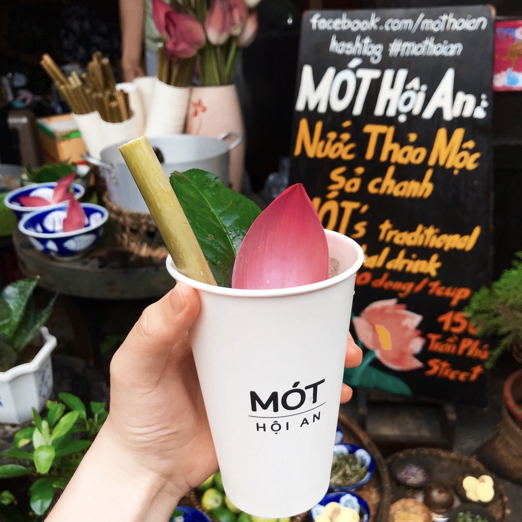 It’s not hard to spot images of these humble drinks with white paper cups, bamboo straws, decorated with fresh tea leaves and pink lotus petals, all of which have been flooded on social media. That’s Mót Hội An — a drink that looks simple, rustic, yet elegantly beautiful, deeply rooted in the traditional charm of the poetic Hội An.