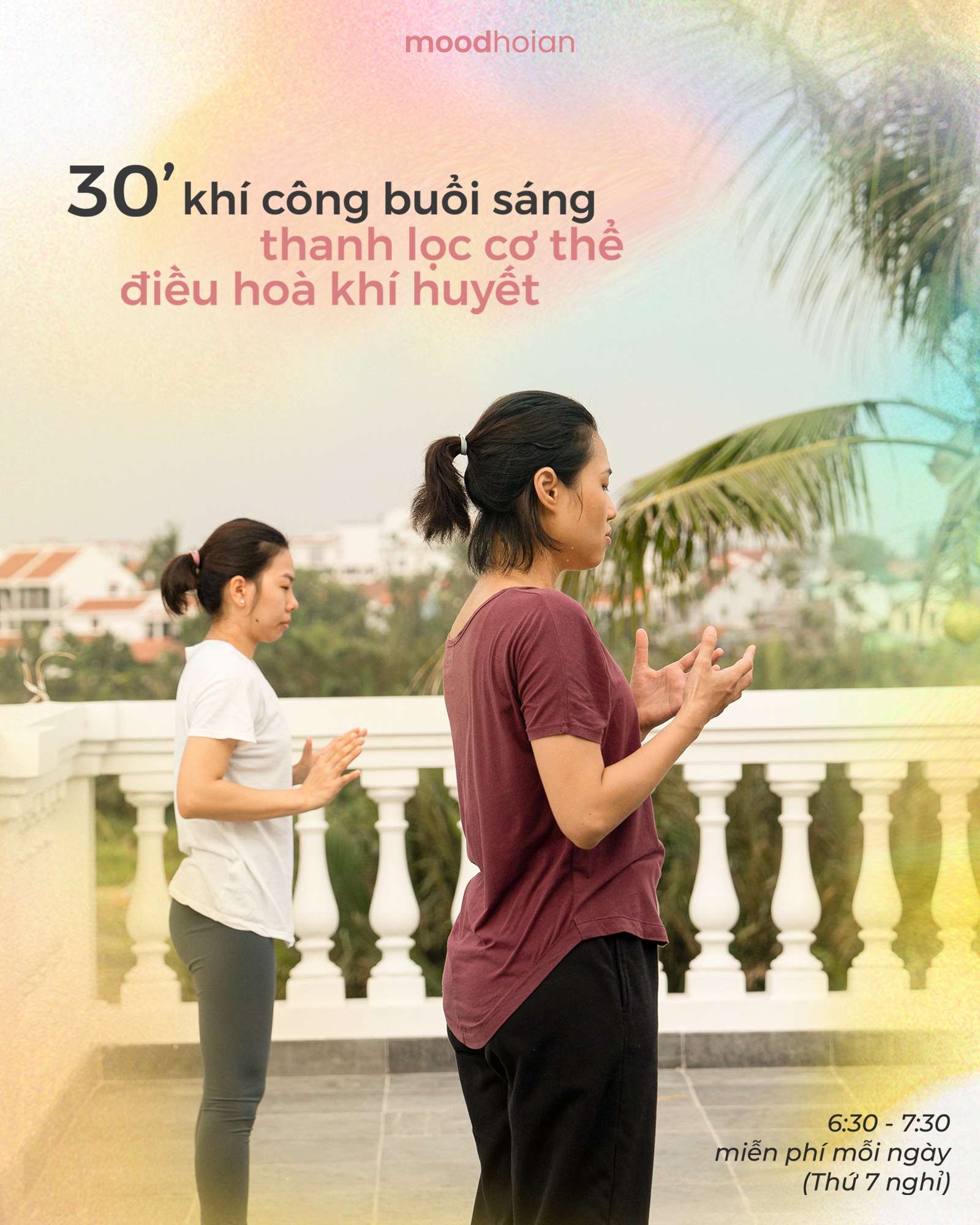 30 phút mỗi sáng, lớp khí công của moodhoian được mở trên sân thượng rộng rãi, thoáng đãng để bạn tập luyện khởi động cơ thể sau một giấc ngủ dài. Giáo viên của mood sẽ hướng dẫn bạn thực hiện từ những động tác cơ bản nhất trong khí công. Đồng thời làm quen với phương pháp tập hít thở, điều khí đến các bộ phận trong khắp cơ thể và vận động mở khớp xương.